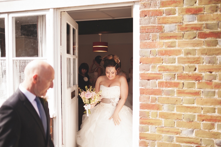Image of bride against orange wall, shot by London Wedding Photographer at Swarling Manor Kent
